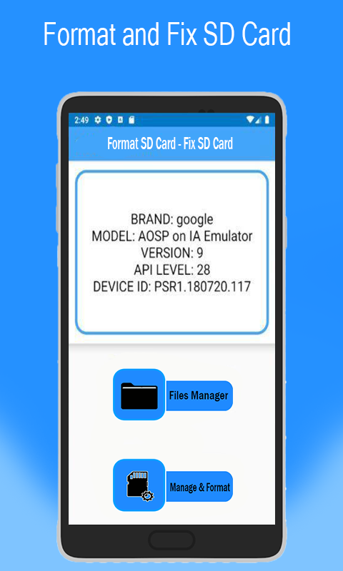 La aplicación Format SD Card le brinda una solución perfecta para formatear su tarjeta de memoria.Puede, con unos pocos pasos, borrar y formatear su tarjeta de memoria dañada con una eficiencia y seguridad asombrosas utilizando esta aplicación y, además, puede guardar sus archivos y datos importantes y recuperarlos. Los datos perdidos (imágenes, videos, archivos) ahora transforman su tarjeta SD en una nueva.