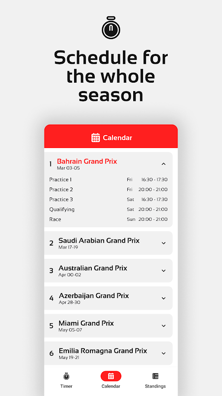 - Calendario para toda la temporada, incluidas todas las prácticas, calificación, sprints y carreras;