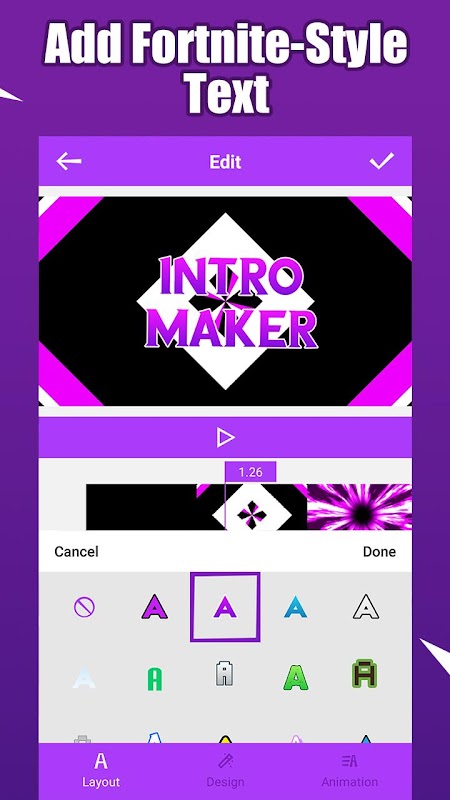Esta aplicación proporciona plantillas de introducción para juegos Fortnite gratis en HD para que puedas crear interesantes presentaciones de video, que harán que tu video se destaque en YouTube. Además, estas plantillas son personalizables y puedes agregar textos, pegatinas, música para diseñar tu propia introducción.