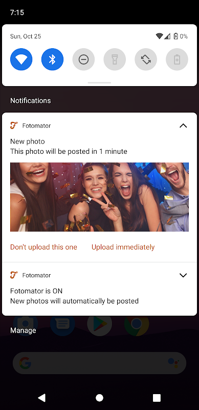 Para evitar compartir cualquier cosa que le gustaría mantener en privado, cada vez que se toma una foto, primero, una notificación con una vista previa de la foto será visible durante un minuto, lo que le da tiempo para descartar la foto antes de compartirla. También puede utilizar esta notificación para compartir la foto inmediatamente.
