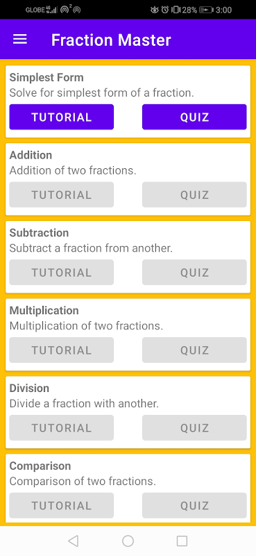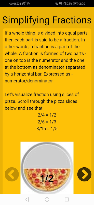An educational app that comes with tutorials and quizzes on how to add, subtract, multiply, divide, simplify fractions. The app concludes with real life word problem to apply what you've learned in the previous sections.