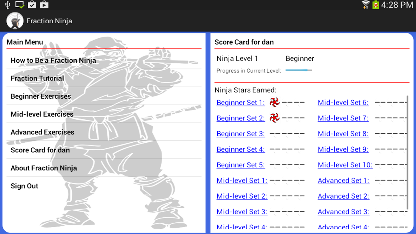 Students work on a wide variety of topics, in any order and for as long as they need. Each student signs in separately so everyone can train at their own pace. Solving fraction problems earns points to gain Ninja Stars and increase Ninja Rank.