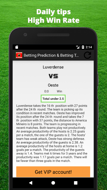 Nuestra aplicación de consejos de apuestas gratuitas ofrece apuestas diarias de fútbol, consejos de apuestas de fútbol. Todas las predicciones deportivas son con una breve descripción que le mostraría por qué exactamente estas predicciones se ganó fútbol actual juego de apuestas.