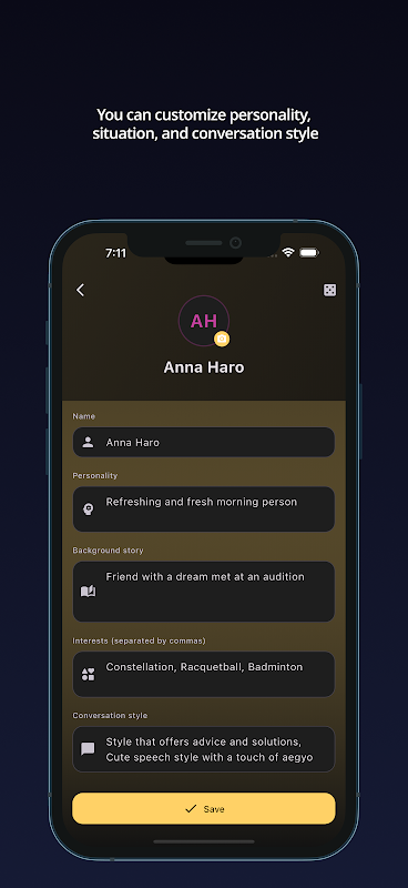 Ve más allá de las conversaciones simples: personaliza la personalidad, la situación y el tono de cada amigo de IA para que se sientan como verdaderos compañeros.