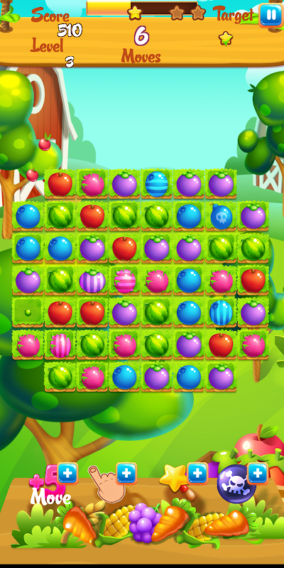 ✔ Match 3 same fruits to collect the candies and to complete each level. Match 4, 5 same times and other cross same fruits to get special booster fruits.