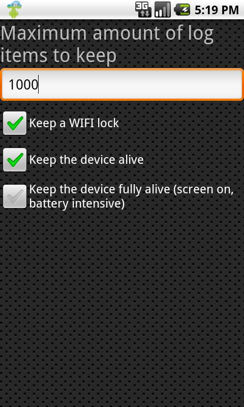 - On the settings page of the app you can set the maximum log items to keep, whether to keep a WIFI lock (prevent WIFI from disconnecting automatically), keep the device alive, keep the device alive full (keep the screen on, battery intensive), set to start the app on boot