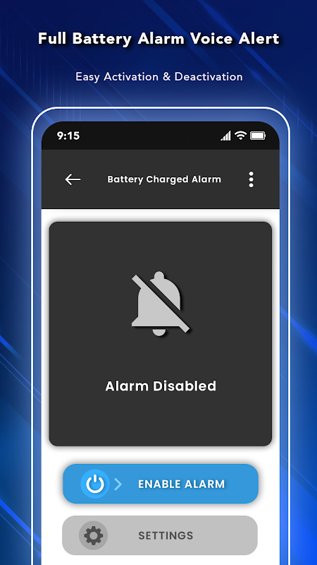 Teniendo en cuenta la conservación de energía, hemos desarrollado la aplicación 'Alarma de batería al 100 %' que le avisará con una alarma cuando la batería esté cargada al 100 %. Deje de cargar innecesariamente, cuide su dispositivo, ahorre energía y electricidad.