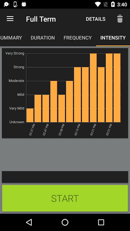 Tiene que tocar un solo botón para realizar el seguimiento del inicio y el final de cada uno de sus contracciones, y "período completo" se hará cargo del resto. La aplicación está diseñada para realizar un seguimiento de las veces, la duración y la frecuencia de todo el período de trabajo.
