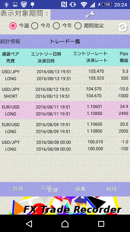 FXトレード(外国為替証拠金取引)を記録、メモし、収支管理、自己分析するアプリです。