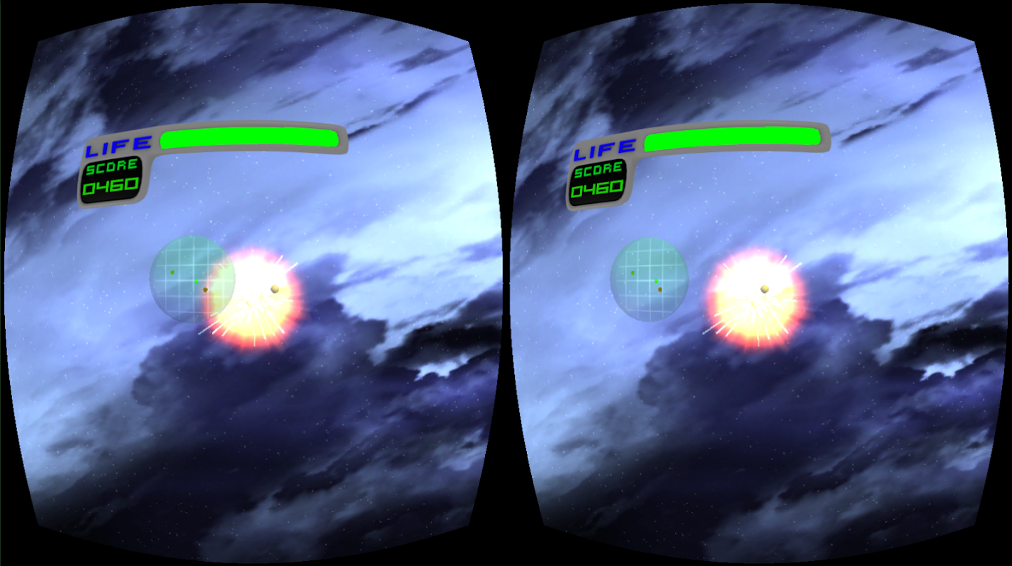 Beenoculus created a version of the classic Asteroids, from the well-known video game Atari, in a viscous reality. You start the game before putting your smartphone in your virtual reality glasses, there is a pause that allows this action. From this, you are the commander of this ship and your mission is to destroy the ateroids that are coming towards you, before they destroy you. The three-dimensional radar on the left side will help you to see which direction the asteroids come from, to find them and destroy them just turn your head in the direction indicated on the map.