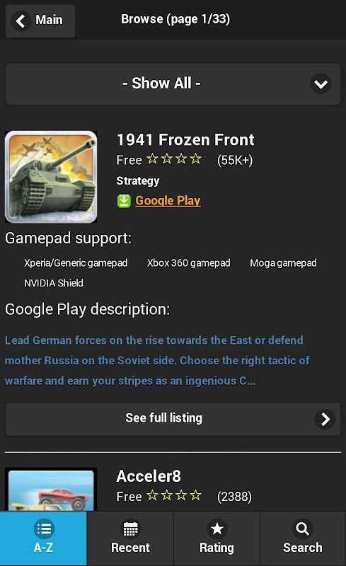 The android games listed in this app (OVER 900 and growing!) can all be played with a gamepad controller on your Android device! And now, you can even launch your games directly from this app.