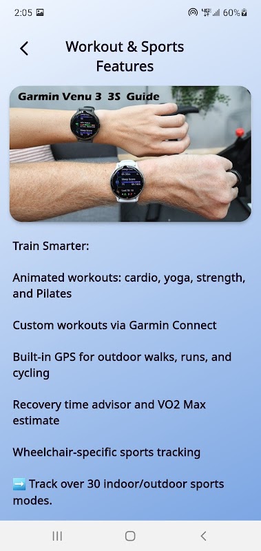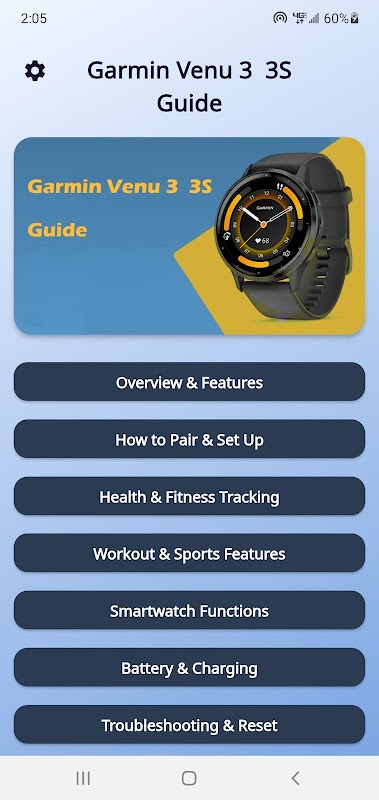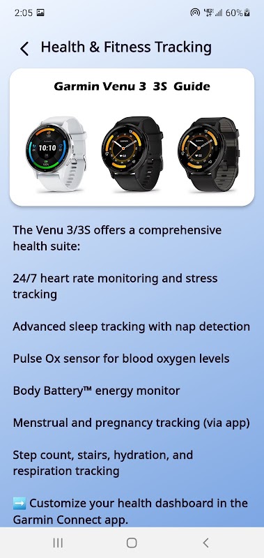 Esta aplicación está diseñada para ayudar a los usuarios a comprender y navegar por las funciones de los smartwatches Garmin Venu 3 y Venu 3S. Ofrece información clara y estructurada para facilitar la configuración, la personalización y el uso diario.