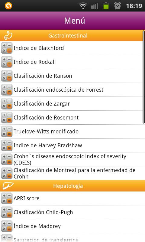 Batería de calculadoras científicas de uso indispensable para el especialista de digestivo. Agrupadas por categorías: Generales de la práctica clínica, Gastrointestinal (incluyen Enfermedad Inflamatoria Intestinal), Hepatología y Epidemiología Clínica.