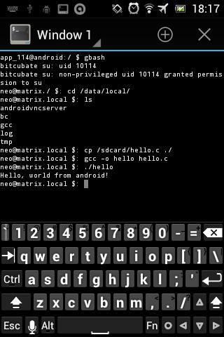This app installs the GNU GCC Compiler to SDCard. You need to have 200 MB free space.