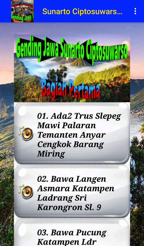 La canción gending javanesa Sunarto Ciptosuwarso 1 es la primera parte de la aplicación de la canción gending javanesa que contiene las mejores obras del legendario observador cultural javanés, Ki Sunarto Ciptosuwarso. Disfrute de la belleza del coro de música Gending javanesa con la voz melodiosa del sinden expuesto a la tierra de Jawi. Disfrute de la mejor generación javanesa de Ki Sunarto Ciptosuwarso, como Ketawang Ibu Pretiwi, Palaran Pangkur, Bring Sudira Wicitro Katampen Gending Bondhet, Ketawang Subakastawa Kalajengaken Ayak-Ayakan, etc. Por supuesto, esta aplicación es muy adecuada para los fanáticos de la cultura clásica javanesa, especialmente el arte de la música.