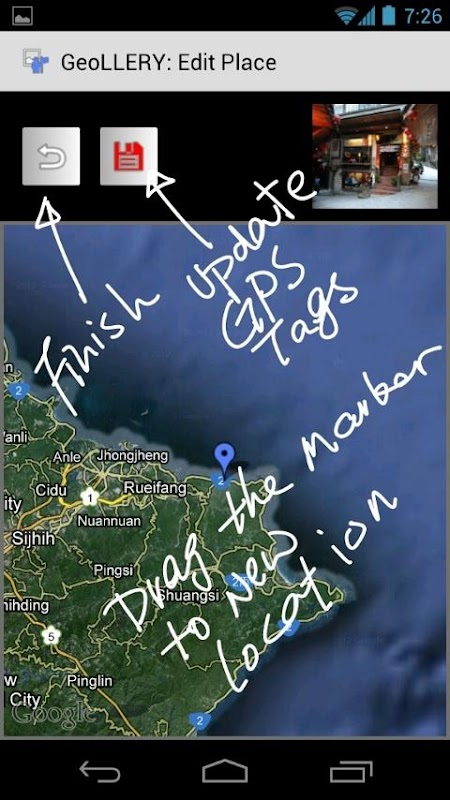 - Tap on the "My Place" icon to edit GPS Tags of the JPG Exif.