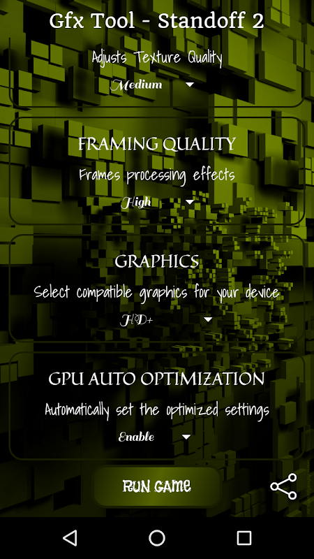 Gráficos es lo que está buscando si necesita mejorar sus imágenes sin el dolor de cabeza de volver a configurar manualmente su teléfono inteligente. Todo lo que tiene que hacer es seleccionar la resolución que desee, cuadros por segundo y el tipo de gráficos que desea mostrar.
