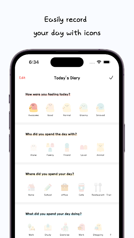 Registra quién y qué hiciste a lo largo del día con varios íconos. Manténgalo simple con íconos en días regulares y grabe con escritos largos junto con fotos en días especiales.
