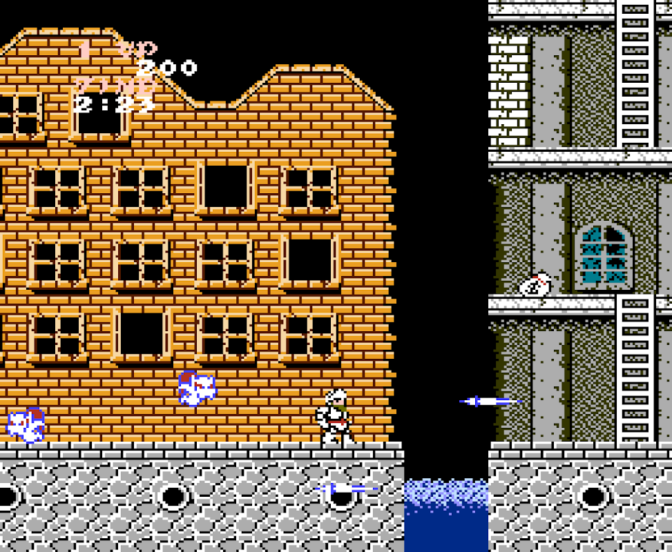 You control Arthur throughout his quest to reach the chamber at the top of the guarded castle, and rescue the Princess PrinPrin. Arthur can run, jump, and throw weapons at his enemies. Arthur’s armor will protect him from one hit. If he is struck while wearing the armor, the armor will fall to pieces. While in this state, if just one enemy touches him, Arthur is doomed and loses one life. It's possible to find and collect armor when Arthur is without any, but they are usually hidden from sight.