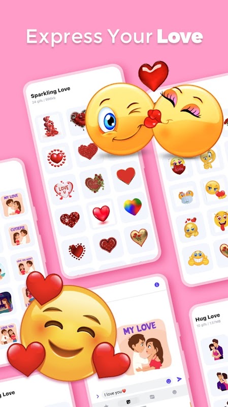 Every time you have sweet chats on WhatsApp, send love stickers & love heart GIFs. It tells more than words! Love collections cover kiss stickers & love heart GIFs for expression of miss, hug stickers & love emoji GIFs for Valentine's day, proposal, anniversary, wedding, etc.