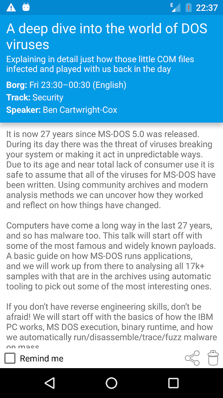 Le permite organizar su visita: seleccione las charlas que desee recordar (con advertencias en caso de conflictos) u oculte los temas que le interesan menos. Los horarios se muestran en el formato que desee: horarios en bloque, horarios simples, búsqueda rápida o el día mismo, una breve pantalla de ahora y el próximo.