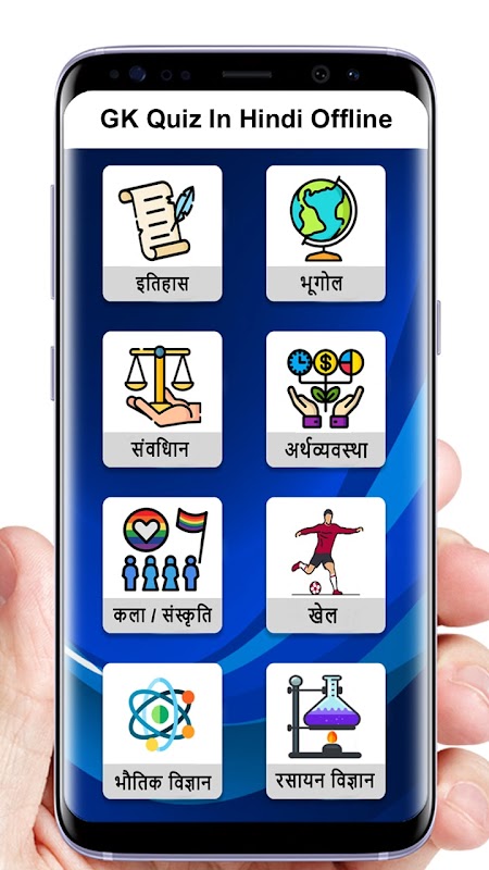 this GK Quiz in Hindi offline app 1000+ general knowledge questions, from various categories such as Polity gk, Economic, history, Bhugol Samanya Vigyaan, Khel In Kala OurSanskriti, Itihas, Geography, General Science, , Economic, Polity,vividh , and Hindi Vyakaran