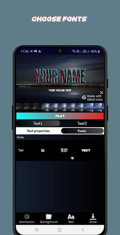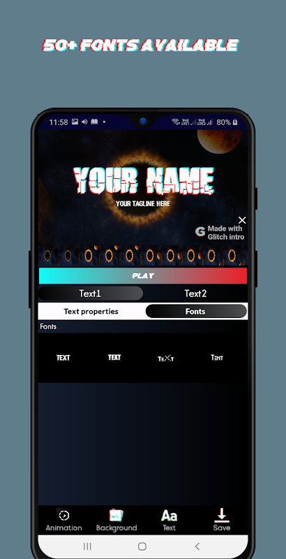 Puedes elegir cualquier fondo para hacer que los textos con errores tengan un efecto en él. Con orgullo decimos que este es el primer creador de videos de introducción de efectos de texto Glitch original en Play Store.