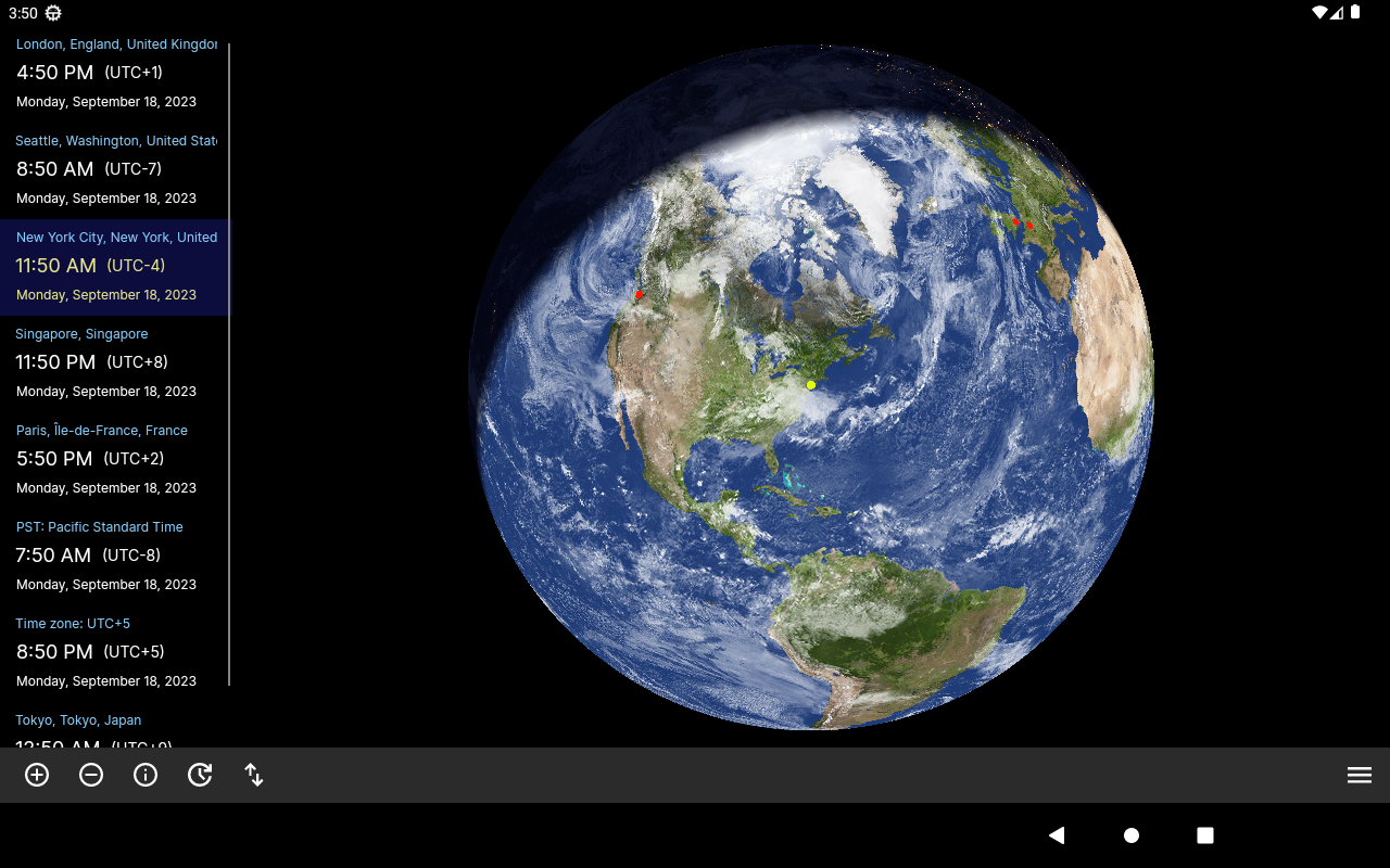 Esta aplicación proporciona información sobre los horarios locales en las ciudades de todo el mundo. Además se muestra la Tierra por lo que es muy fácil de averiguar, si es de día o de noche en lugares específicos. Es posible seleccionar una ciudad y el mundo gira, por lo que la ciudad seleccionada está en el centro.