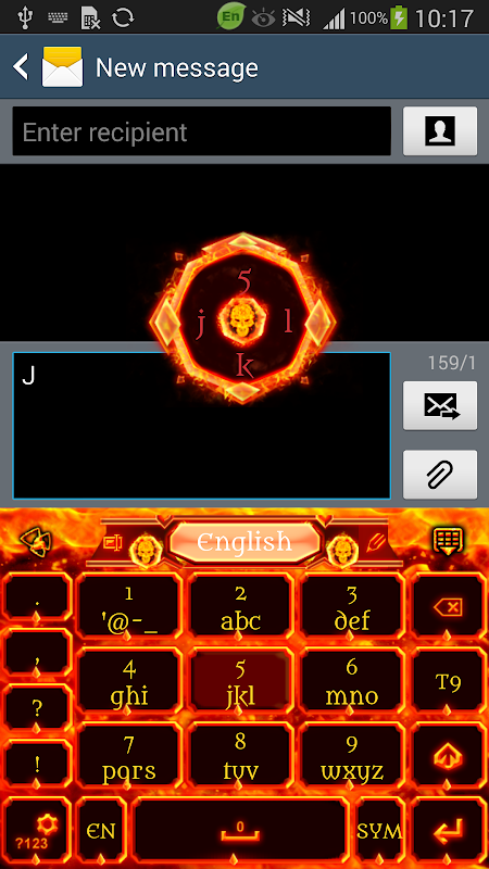 "GO Keyboard Fire Skull Theme" is a free theme, designed by Inner Works Studios, that features an evilly morphed hell skull consumed by realistic hell fire, with particles of burning amber surrounding it. This Gothic theme features glowing red framed dark black buttons on a bright flame filled background. Fire up your phone with this hellish Fire Skull Theme!