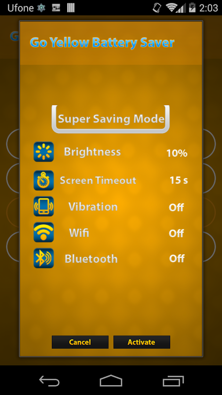 la mejor batería proporciona verdaderos métodos para salvar la vida de la batería. El protector de la batería Ir amarillo va a monitorear aplicaciones y cuáles son pierda su vida de la batería. También es útil para los basculantes para Wi-Fi, 3G, los datos móviles 4G, el modo de avión, GPS, Bluetooth, y la aplicación de otros, puede gestionar sus sensores de telefonía móvil, el brillo de la telefonía móvil, la batería aplicación de protector de cargador que mantener las aplicaciones y servicios de funcionamiento y el sistema de nivel.