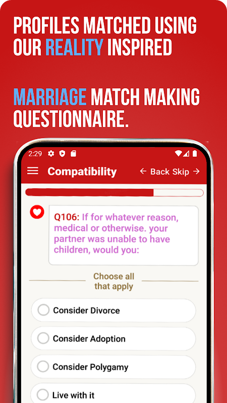 Nuestro algoritmo basado en la realidad, basado en el cuestionario de emparejamiento matrimonial, lo empareja con personas más allá de la apariencia. Personas que encajan perfectamente contigo. Más profundo que solo miradas y líneas de recogida.