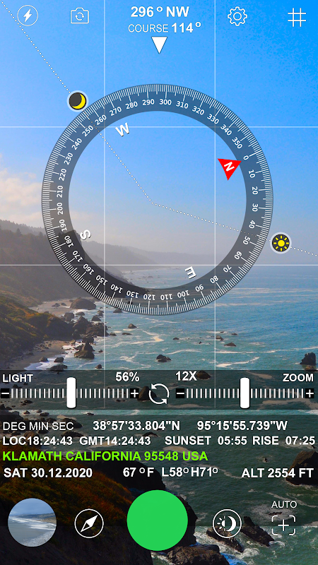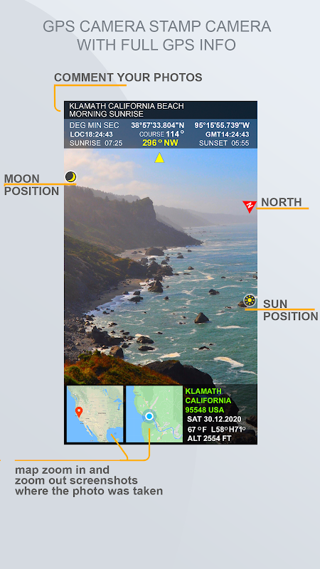 App take stamp photos with GPS location, compass direction, altitude, date & time taken map screnshot, sunrise sunset ,sun moon locator capture editable notes such as project name and photo description, street address and UTM/MGRS coordinate formats.