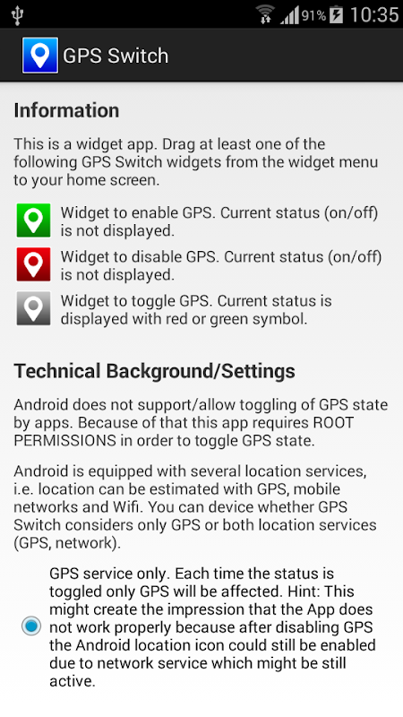 Alternar estado GPS por aplicaciones por lo general no se permite / apoyada por Android. Por lo tanto, esta aplicación requiere permisos de root! Si usted no sabe lo que esto significa, por favor, no instale esta aplicación!