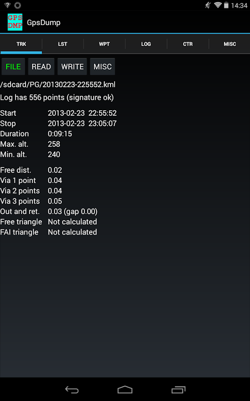 Guardar tracklogs en archivos (Registro de vuelos, CIG, Ozi, formatos GPX). Leer archivos de waypoint (GEO, Ozi, WinPilot, CompeGPS, SeeYou). Escribe archivos de waypoints (GEO, Ozi, GoogleEarth, WinPilot, CompeGPS, SeeYou, GPX).