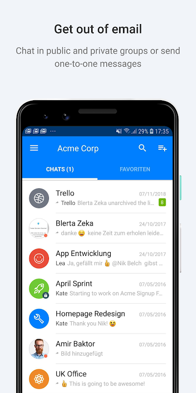 The Grape App for Android allows you to check on all your conversations while on the go. Get access to your rooms, private messages, and stay in touch with your colleagues and all activities from external services. All within a beautiful application built for your device with a particular focus on design.