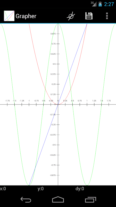 Plot functions and trace their graphs with ease! This is a simple graphing calculator with graphing capabilities similar to TI-83 or TI-89 calculators. To start adding equations, tap the graph! There are no ads, because I hate ads.