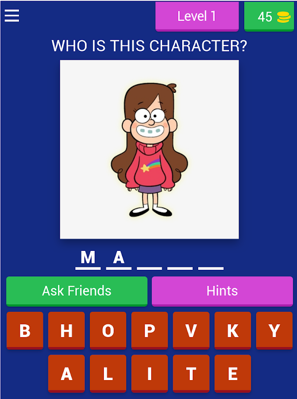 ¡Los personajes favoritos de GRAVITY FALLS ya te están esperando en un emocionante juego de adivinar el personaje! En nuestros juegos de preguntas y respuestas, presenta los personajes más populares que solo tú conoces. Todo lo que necesitas en los juegos de personajes sin conexión es deletrear correctamente el nombre del personaje de las letras presentadas. Por cada respuesta escrita correctamente, recibirás monedas. Más tarde te serán útiles para comprar consejos, si no estás seguro o no sabes la respuesta a la pregunta en el cuestionario de personajes del juego. El juego de adivinar personajes no es difícil si observas cuidadosamente los dibujos animados.