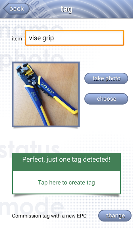 •Tag – Commission a UHF Gen 2 RFID tag and enter the item into your database or associate a name and picture with any already commissioned tag.