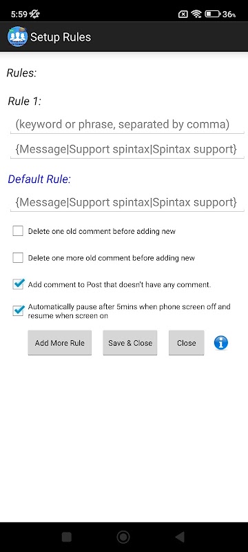 Group Post Auto Comment tiene un motor AI que lo ayudará a agregar comentarios a su publicación de grupo anterior automáticamente en función de la coincidencia de palabras clave y el mensaje SpinTax.