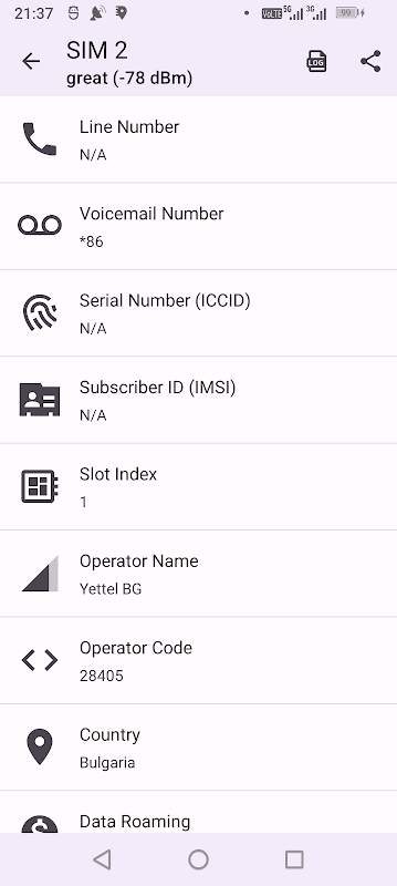 La aplicación también proporciona información sobre las tarjetas SIM del dispositivo, como número de teléfono, número de correo de voz, número de serie de la tarjeta SIM (ICCID), identificación del suscriptor (IMSI), información del operador móvil y tipo de red. Esta información de la tarjeta SIM se puede compartir fácilmente tocando el botón compartir o copiarla en el portapapeles del dispositivo.