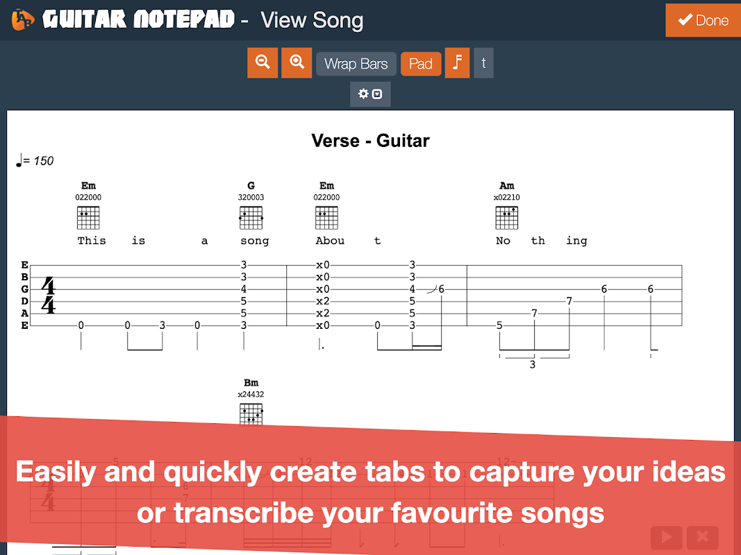 - Agregue acordes, patrones de rasgueo y letras sobre sus notas con pestañas (¡ninguna otra aplicación que haya visto apoya esto!)