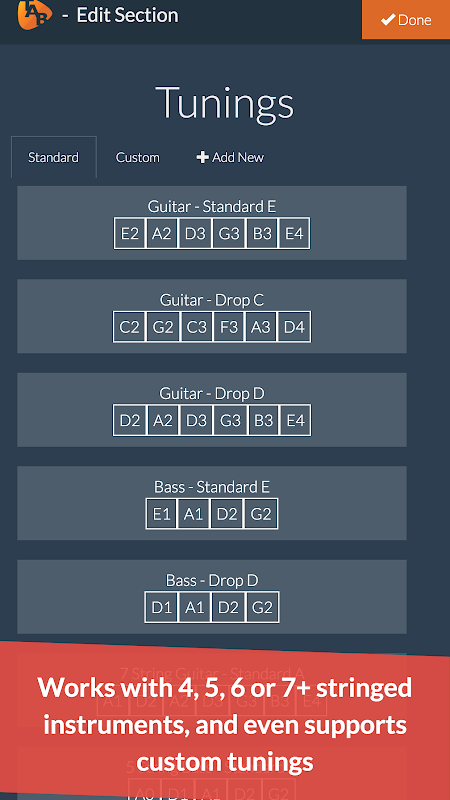 - Agregue cualquier número de cuerdas y afinaciones personalizadas, incluidas las guitarras / bajos de 4,5,6 y 7 cuerdas