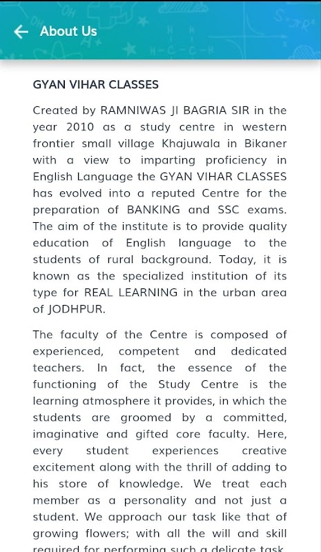 Created by RAMNIWAS JI BAGRIA SIR in the year 2010 as a study centre in western frontier small village Khajuwala in Bikaner with a view to imparting proficiency in English Language the GYAN VIHAR CLASSES has evolved into a reputed Centre for the preparation of BANKING and SSC exams. The aim of the institute is to provide quality education of English language to the students of rural background. Today, it is known as the specialized institution of its type for REAL LEARNING in the urban area of JODHPUR.