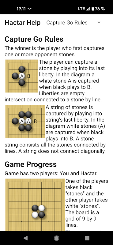 Go es un antiguo juego de estrategia de reglas simples. Hactar go es perfecto para aprender go, y para estudiar go dondequiera que estés. La mejor manera de aprender go es con el juego de go de captura. Hactar puede jugar go de captura contigo.