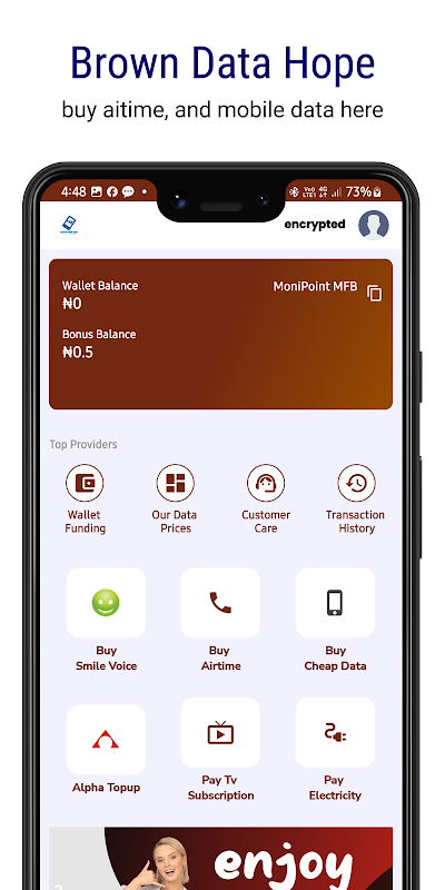 Con la aplicación Brown Hope Data, usted compra y revende diferentes tipos de paquetes de datos asequibles y económicos de todos los proveedores de redes como MTN, Airtel, Glo, 9Mobile y Smile; en Nigeria.