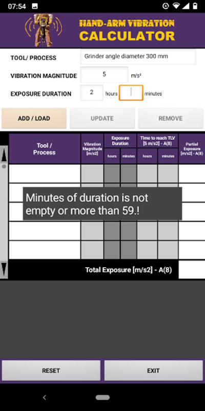 Ingrese el nombre de la herramienta, la magnitud de la herramienta y la duración de la exposición, esta aplicación automáticamente: