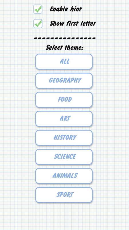 ¡Deja de desperdiciar papel! Ahora puedes jugar un popular juego de puzzle de palabras (Hangman) en tu dispositivo Android de forma gratuita. Adivina la palabra oculta seleccionando letras. Cada letra incorrecta es un elemento del ahorcado.