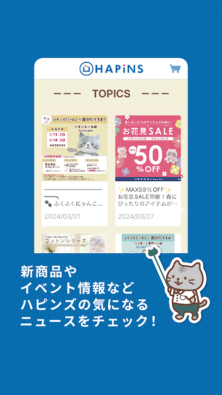 Con la aplicación oficial de la tienda de artículos de interior HAPiNS, puedes recibir rápidamente información sobre nuevos productos y grandes ofertas, así como comprar desde la aplicación y ver fondos de pantalla originales y contenido de introducción de personajes exclusivo de la aplicación. ¡También distribuiremos cupones exclusivos para la aplicación!