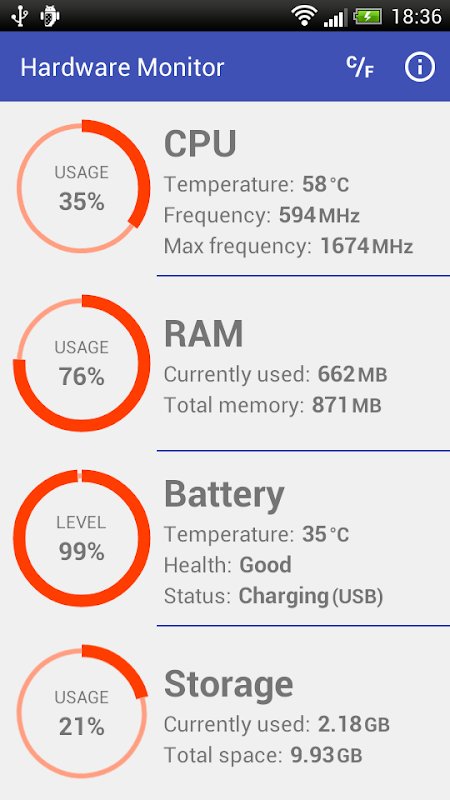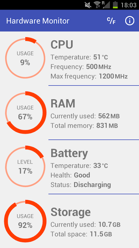 Simple but powerful tool for monitoring CPU, RAM, battery and storage values of your device.