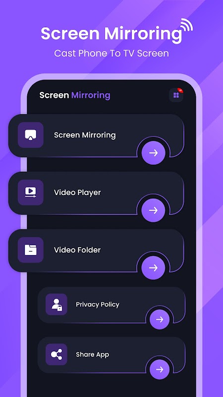 Screen Mirroring with TV App lo ayudará a escanear y reflejar la pantalla de su teléfono en un televisor/pantalla inteligente. Con la aplicación Screen Mirror, compartir la pantalla es rápido y sencillo.